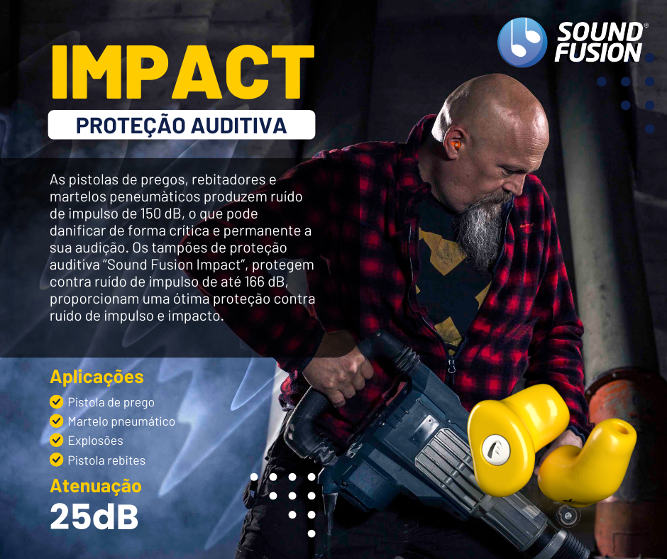 Os tampões de proteção auditiva “Sound Fusion Impact”, protegem contra ruído de impulso de até 166 dB, proporcionam uma ótima proteção contra ruído de impulso e impacto.